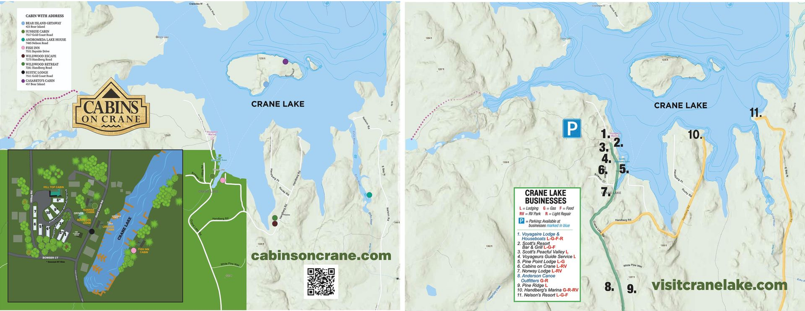 Cabins on Crane, a year-round resort and RV park on the shores of Crane Lake, is one of Minnesota's last wild vacation destinations. Enjoy fishing, boating, ATV riding, snowmobiling, and more in this historic area, with attractions from logging camps to native heritage. Nestled between Voyageurs National Park and the Boundary Waters, Crane Lake has been a beloved retreat since the 1800s. Experience the adventure and beauty of Voyageur Country.